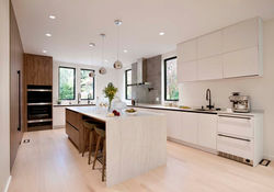 The project represents a prototype for a modern home which incorporates an accessory dwelling unit to increase the residential density on the site, while minimizing impacts to abutters. The house is carefully configured and scaled to minimize the impact of the ADU, while optimizing light and view in the main house. The plan of the main house is configured around an open central stair which defines the main entry, while providing substanial light at the core of the house and defining a small library and reading nook at the second floor level. The living spaces then radiate in every direction from this center point. Because the clients for the project are avid chefs, the first floor plan layout centers around a large open-plan kitchen which connects to indoor and outdoor dining spaces to facilitate conversation while cooking. The millwork in the first floor spaces utilizes a simple, modern layout. Details such as a hidden pantry and a built-in refrigerator are concealed behind a wall of wood paneling to ensure that the overall character of the space is simple and elegant.